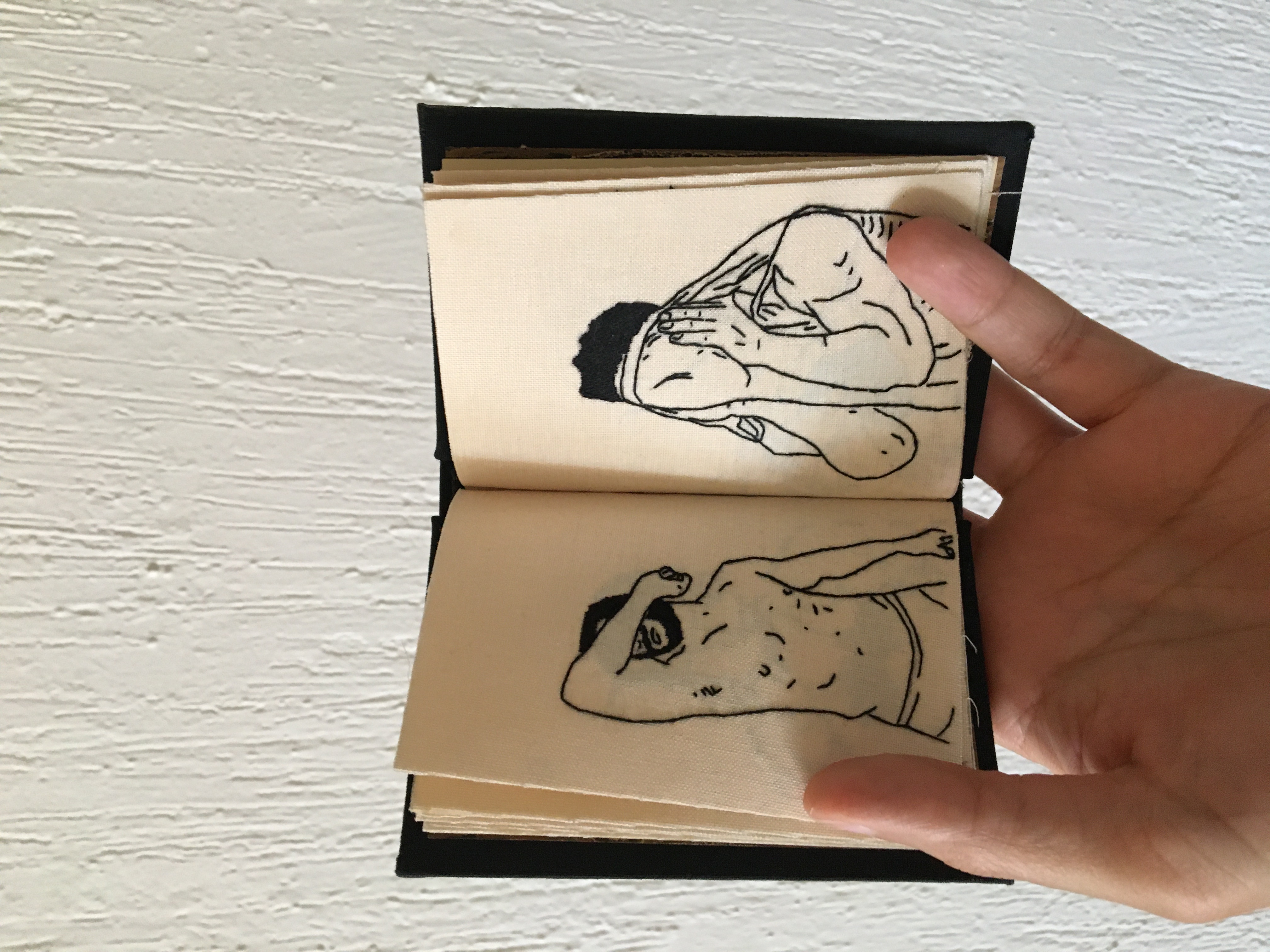 Drawings that read like texts, and texts that are grouped in a book that fits in your hands to emphasize its intimate, portable, tactile nature. These books contain a theme expressed throughout their 14 original embroideries, without any writing other than the visuality that sustains them. Each book-object is hand-bound and contains 14 handmade embroideries. Endpapers on marbled paper. Title on cover printed with movable type.